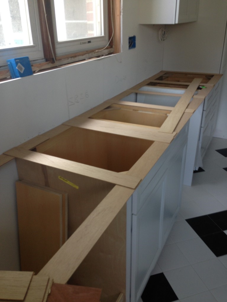 This counter (above) will be one long counter which sits over two dishwashers, flanking a large kitchen sink.