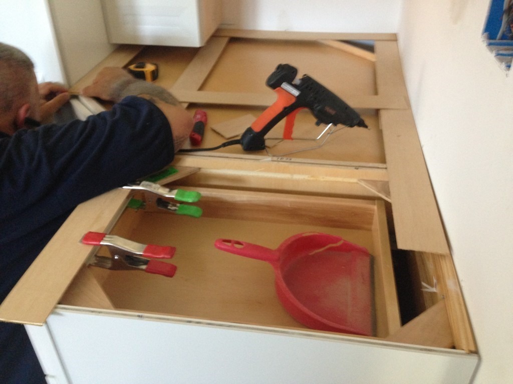 From the front edge, which will have about a 1.5 inch overhang….he first clamps the wood strip exactly where the counter will eventually sit. Those clamps insure that the strip won’t move as he works. Then, cutting strips to size and gluing them in place, he works back towards the other side of the “island” , which will have an overhang for seating. The part of the island closest to the bottom of the picture will also have an overhang for seating and that’s why the two long strips hang way over the edge of the base cabinet.